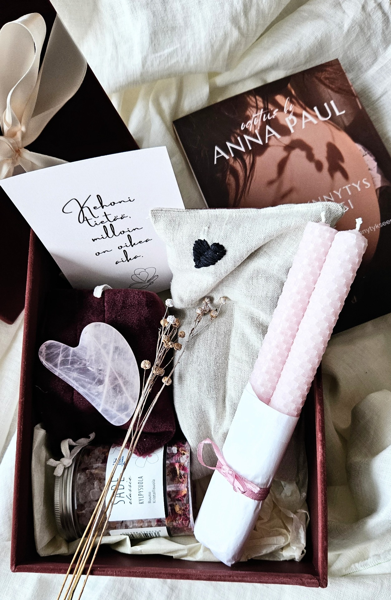 Täydellinen tuotepaketti synnytystä odottavalle. Tämä tuotepaketin myötä annat itsellesi tai jollekin läheiselle odottajalle kaiken, mitä hän synnytykseen ja loppuraskauteen tarvitsee. Se valmistaa kehoa ja mieltä synnytykseen tiedon, tehtävien ja ihanien hemmottelutuotteiden avulla.