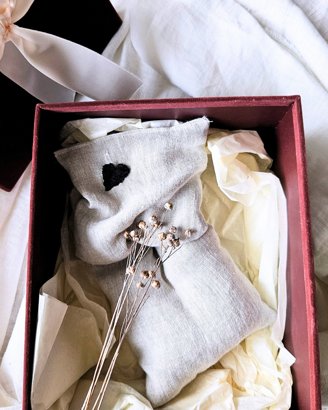 - käsin valmistetun ja -kirjaillun, lämmittettävän tai viilennettävän pellava-ohratyynyn