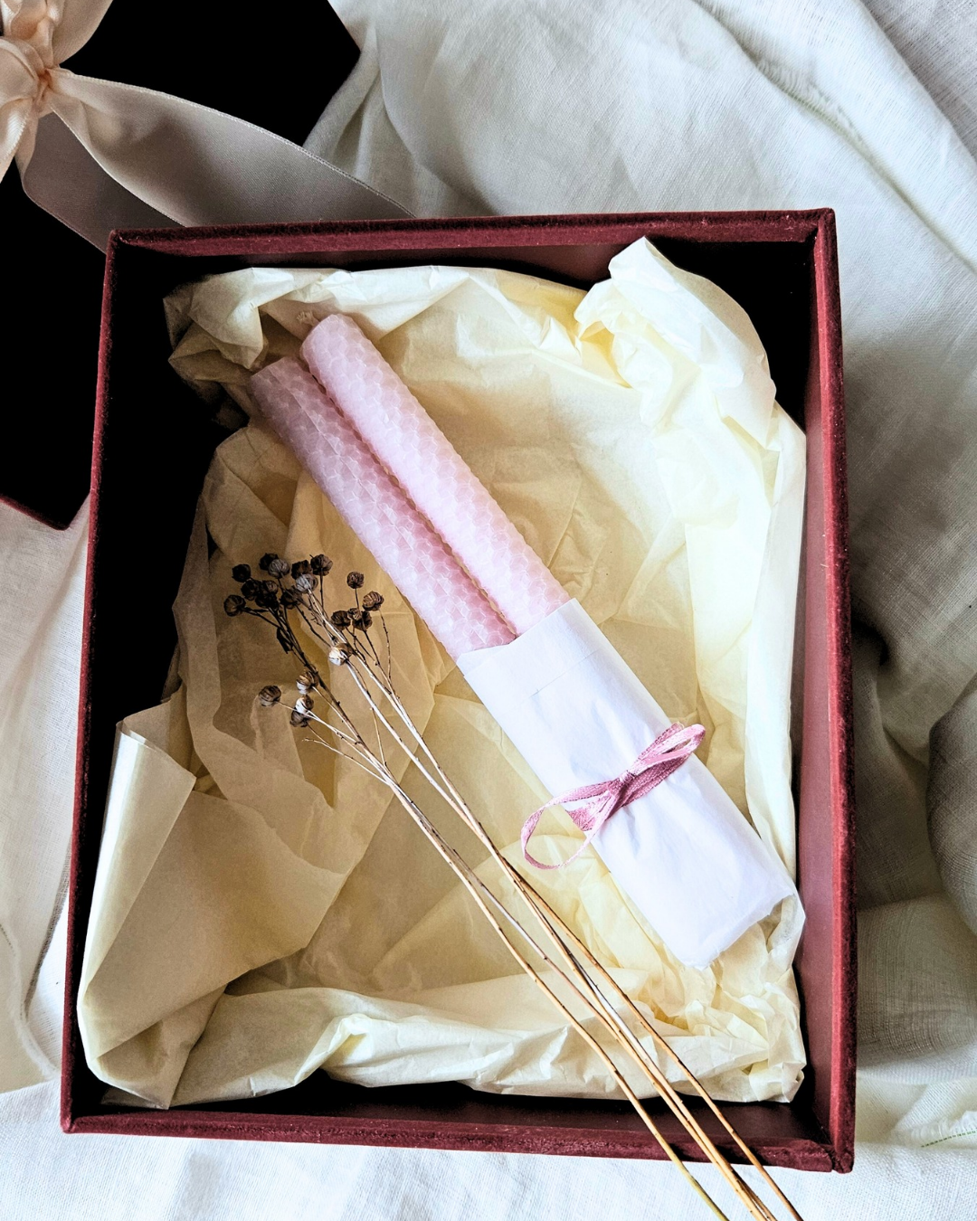 - 2 kpl käsin valmistettua mehiläisvahakynttilää